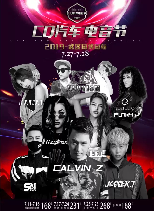2019CQ汽车电音节武汉站,众星云集,打造最火爆的现场,最热血沸腾的电音节,7月28日,武汉园博园南广场,等你一起来嗨翻全场!