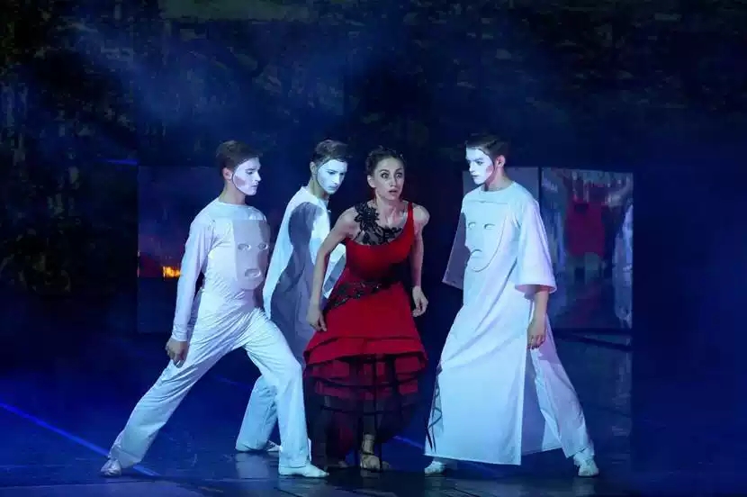 舞台上安娜的服装,以白色、黑色和血红色的不同时间登场,象征纯洁、黑暗与激情,预示安娜命运的几个极端阶段,也隐喻人物内心的复杂层面。安娜是尽职尽责的妻子、慈爱的母亲,也是充满激情的情人。她时而坚韧,时而赤裸而疯狂地投入婚外恋情。舞蹈家为一对偷情的情人设计了旺盛而大胆的双人舞,如火焰一般燃烧的疯狂舞姿,可谓灵与肉在舞台上的燃烧。