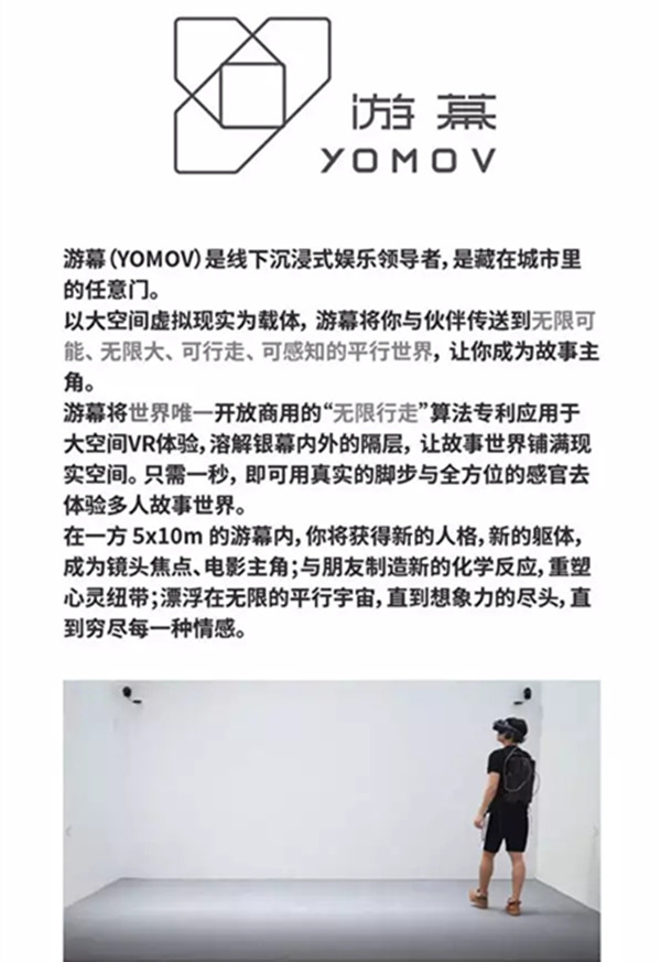 游幕让虚拟现实技术从未如此接近完美,沉浸影像由此将获得新的生命,游幕拥有全球首个开放商用的“无限行走”算法专利。利用人脑难以察觉的视觉差,体验者能用真实的行走在VR中任意移动,感受到无限空间的幻象,而所有的真实行走仅发生在一个50平米的房间。