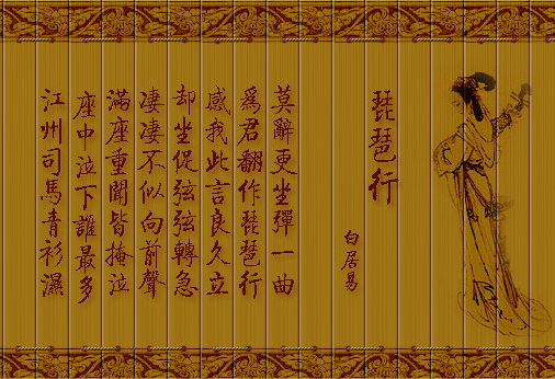 本剧以白居易长篇乐府叙事诗《琵琶行》为蓝本,在尊重历史史实和诗歌原文的基础上,以白居易这一极具代表性的唐代文人为主角,对他郁郁不得志的一生进行演绎改编。舞台二层一把巨型的桌子是精神世界的象征,这是写诗的地方,是用文字表达真善美的地方,所以这是饱满的,清新的。桌子下面便是现实了,阴谋、丑陋、贫困、杀戮、生老病死等等。中心的转台就是白居易的犹豫,就是他的选择,就是他的中间夹层的世界。