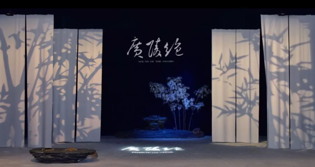 《广陵绝》的舞台古风古韵,舞美以白色作为主基调。一丛枯竹、满地白沙、随风摇曳的白色条屏,这些隐喻和象征的舞台元素意味十足,衬托出古代名士的飘逸风度,而终场的白色沙幕更是给人以惊艳之感。一边是白色调的淡雅和悠然,另一边是黑色调的死亡和牺牲。白与黑的色调融合,亦是生死抉择的情感升华。