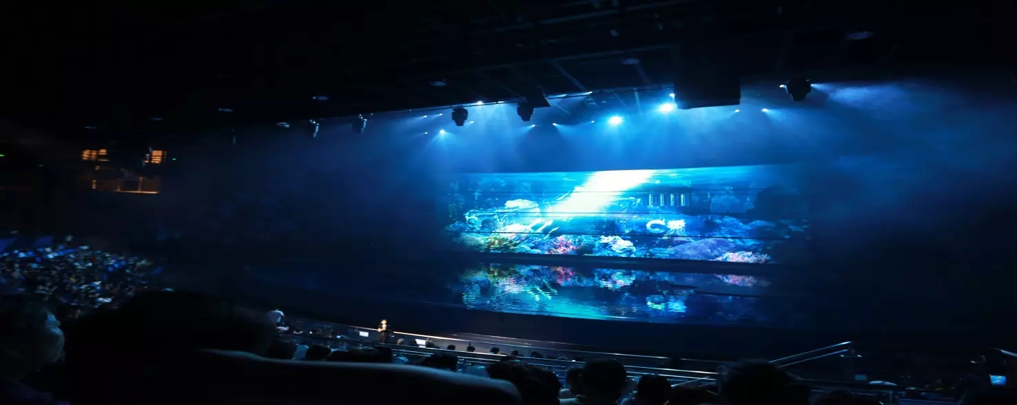 2.海南首个3面环绕式立体观众席 15米高LED超过300平米巨型移动视频墙,7000立方米中央特效水舞台,实现百变场景,打造海洋世界的逼真体验。