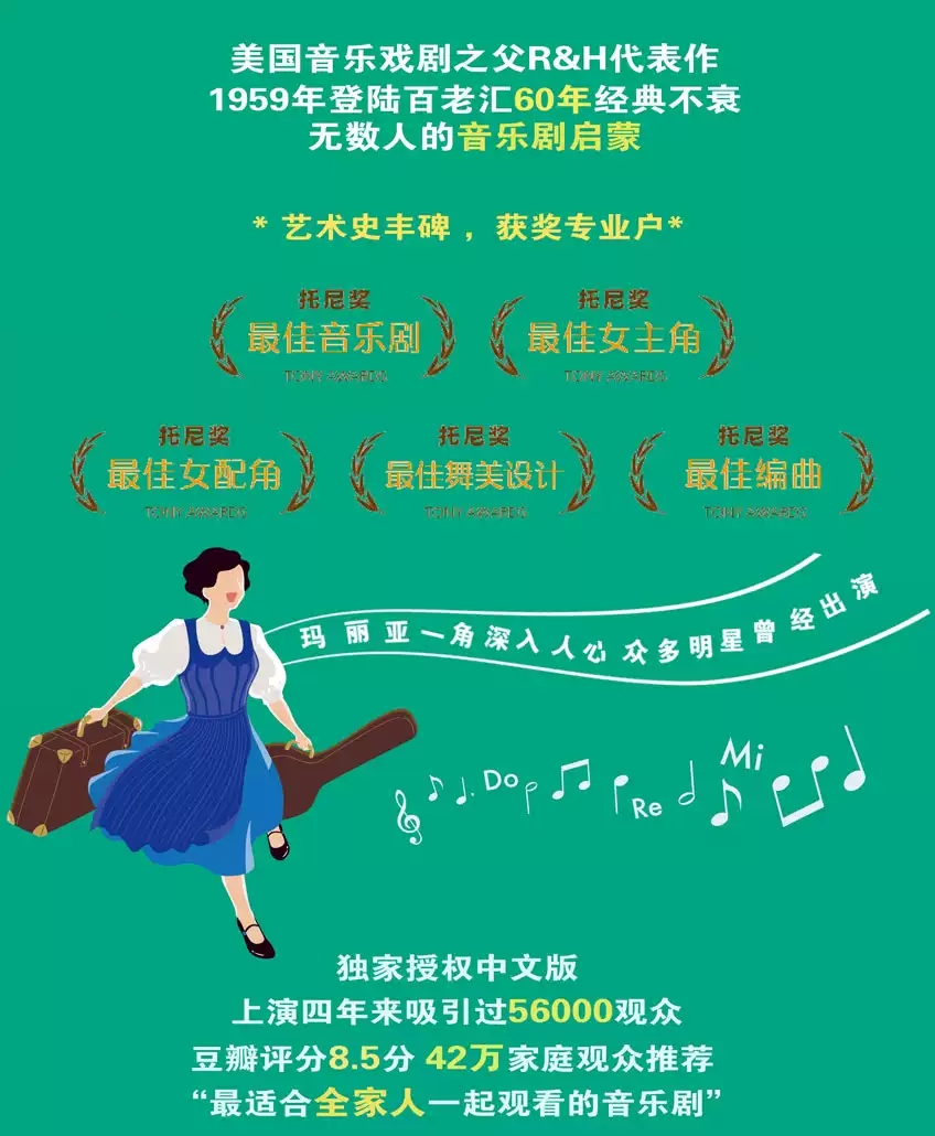 1959年,《音乐之声》音乐剧首次登上百老汇的舞台,成为当年托尼奖最大赢家,独揽了包括“最佳音乐剧”“最佳女主角”“最佳女配角”“最佳舞美设计”“最佳编曲”在内的5项大奖,后来更是被评为全球最受欢迎的音乐剧。