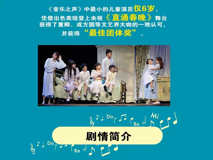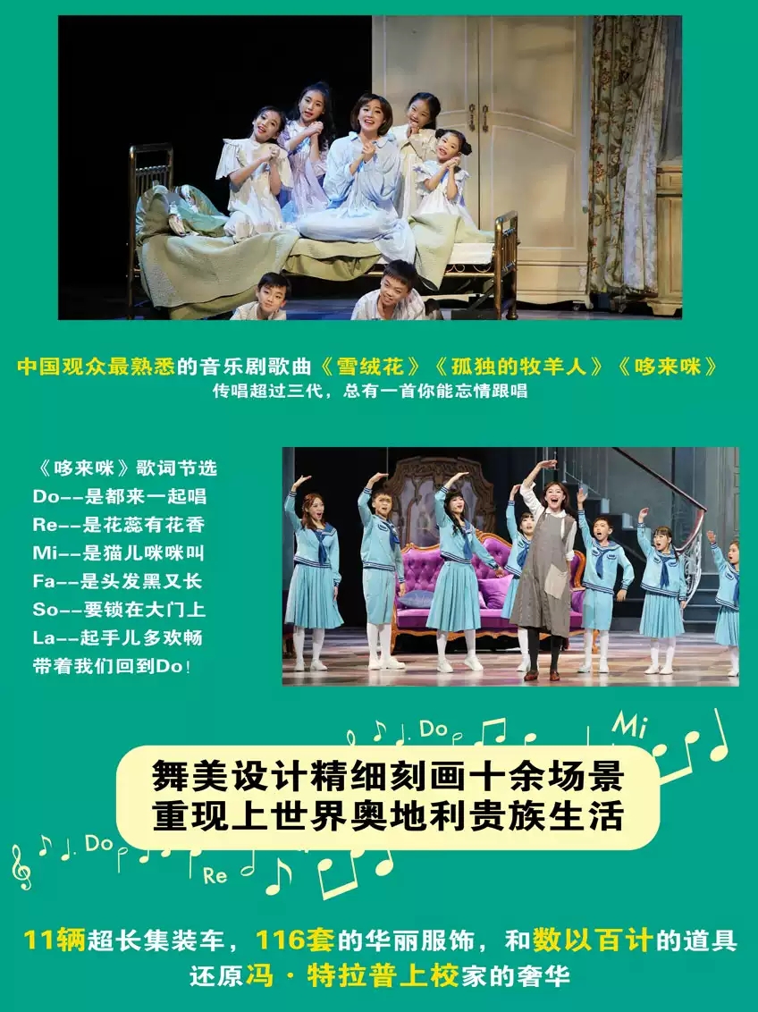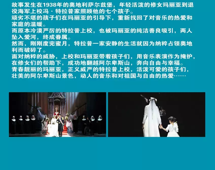 享誉全球的音乐剧《音乐之声》由音乐剧大师理查德•罗杰斯和奥斯卡•汉默斯坦二世联手创作,是这对音乐剧“黄金搭档”的封山之作,由冯•特拉普一家的真实经历改编。