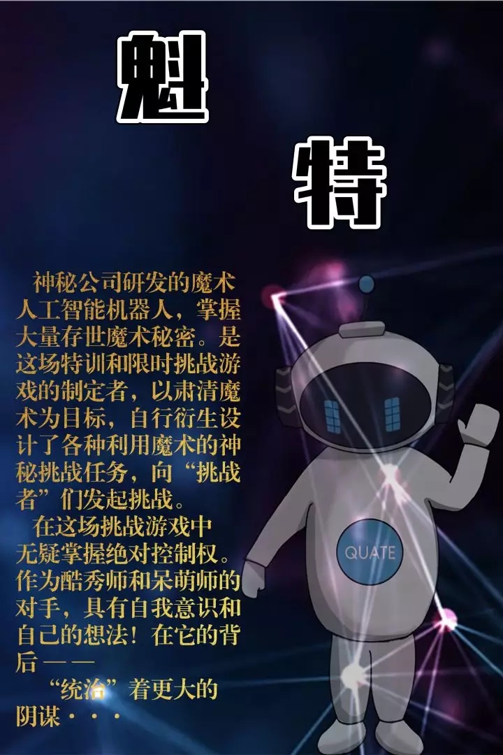 “神秘人工智能”魁特发来挑战邀请函,一群挑战者寻找源头,来到了魔训场闪电集结。这里是魔术秘密的最后堡垒,一个巨大阴谋浮出水面。魁特为肃清魔术,设计了各种利用魔术原理的限时挑战游戏。