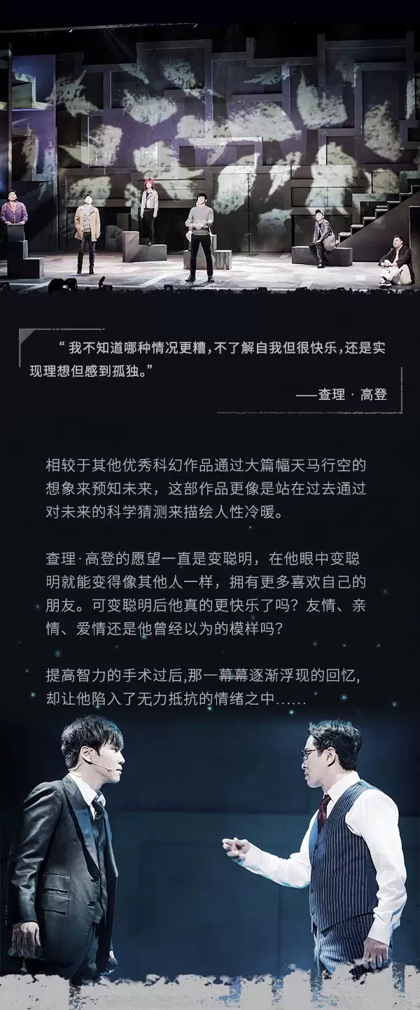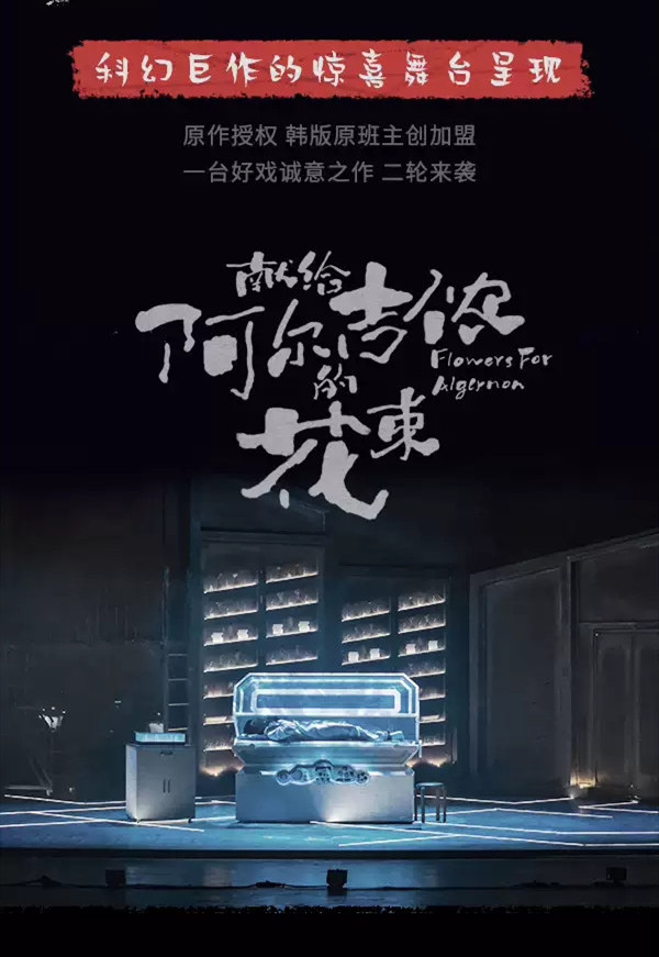 科幻巨作《献给阿尔吉侬的花束》由美国传奇科幻作家丹尼尔·凯斯所著。 自1959年发表以来横扫科幻艺术最高奖项雨果奖与星云奖。在这60年来孵化出20余个版本的多国多语言影视剧、舞台剧改编作品。
