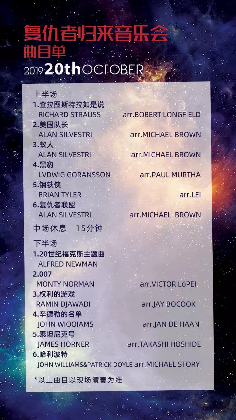 《蚁人》、《黑豹》、《钢铁侠》、《复仇者联盟》电影中的经典主题曲都将彻夜奏响,雅铂交响管乐团将带领各位英雄重回战场。他们将永远激励着怀抱梦想勇敢前进的我们。