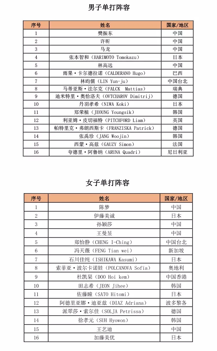此次与去年国际乒联世巡赛总决赛一样,世界排名前16的男运动员和世界排名前16的女运动员将在今年总决赛中争夺男、女单打冠军头衔,赛事将限制每个协会最多派4名球员参赛,确保来自世界各地的明星球员参与其中。