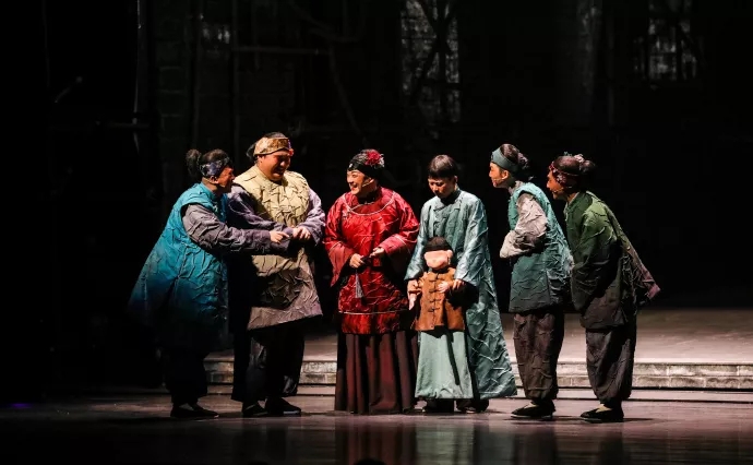 由于本剧人物跨越较大,所以方旭导演首次将“人-偶结合”的表演方式融入到演员表演和舞台视觉中,演员们既是角色又是操纵者,自由的上天下水,在舞台上上演了一出精彩的“武侠片”,同时意象地表现出孩子总是被大人操纵,如同这扯线的木偶。
