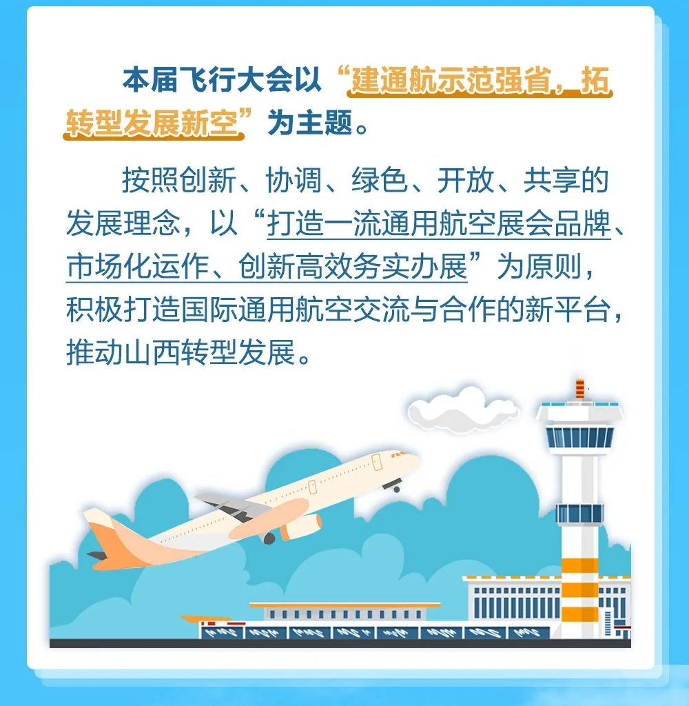 为更好地展示山西省通用航空业,推动全产业链通用航空业加快发展,山西省决定于9月29日在太原市举办尧城(太原)国际通用航空飞行大会。太原航空飞行大会,让山西人在家门口观世界,开眼界,游盛会,看未来。