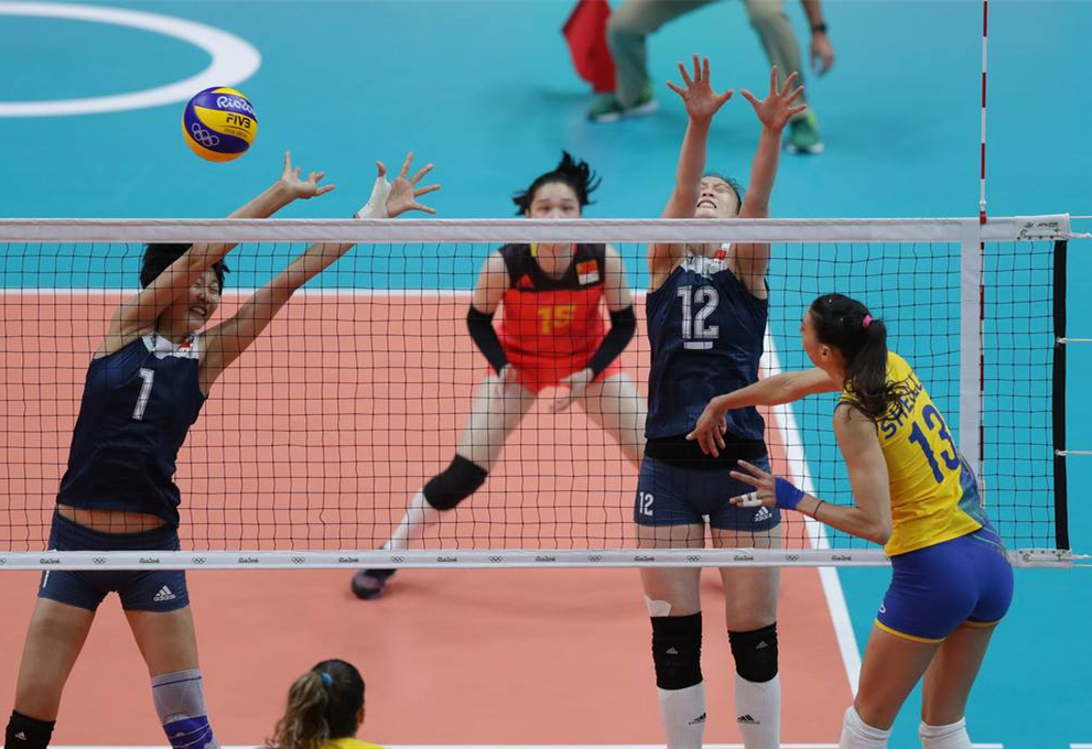排球比赛,是由两支人数相等的球队,在球网隔开的两个均等场区内,根据规则,以身体任何部位将球从网上击入对方场区,而不使其在本方场区内落地的一项集体运动项目。比赛采用每球得分制,当一方胜一球时,即得1分,同时获得发球权,并且队员按顺时针方向轮转位置。