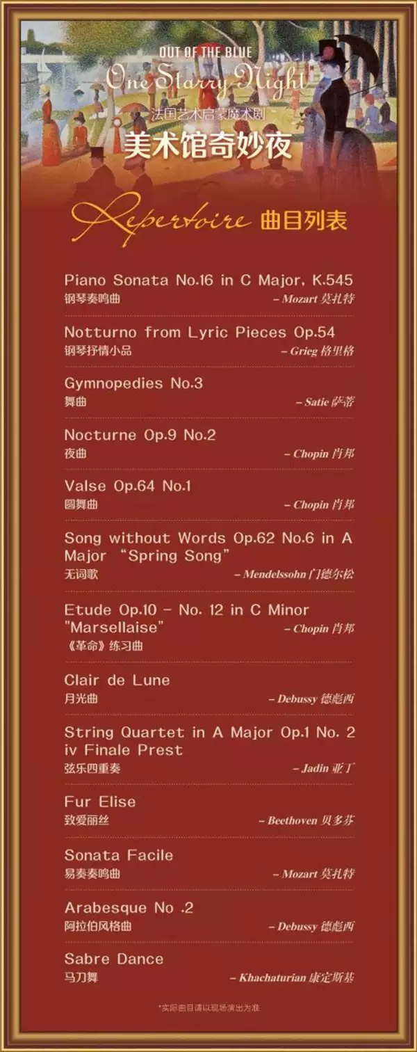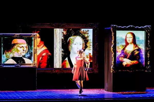《美术馆奇妙夜》的舞台上,世界名画光影交错,经典名曲旋律悠扬,为观众营造出充满诗意的浪漫氛围。演出中,优雅的钢琴师在台上现场伴奏,莫扎特、肖邦、德彪西、格里格等大师乐章与色彩丰富的世界名画和奇妙的魔术表演完美结合在一起。这是生动的名画赏析,也是精彩的视觉钢琴音乐会和少儿音乐启蒙课。