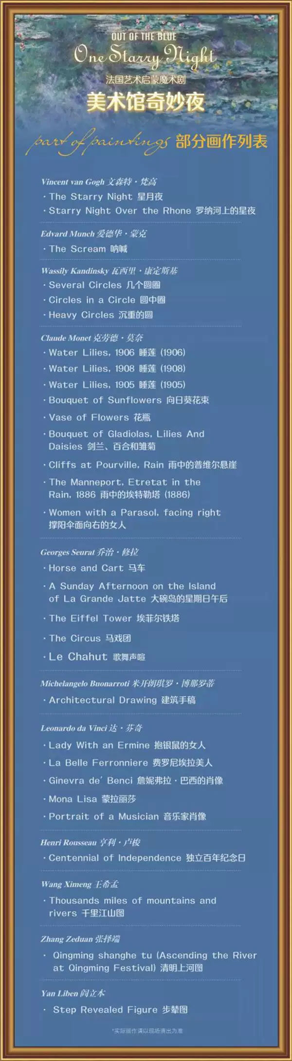 《美术馆奇妙夜》通过观众们喜闻乐见的多媒体魔术形式让世界绘画大师的名作“活”了起来。看莫奈的《睡莲》花池绽开了朵朵睡莲;从梵高《罗纳河上的星夜》的美丽星夜中乘坐月亮船梦幻遨游;一不小心“阿啾”,一个喷嚏把乔治·修拉的《埃菲尔铁塔》给吹没了一半;超乎想象的多媒体魔术一个接一个,为家长和孩子们创造一个个神奇的艺术现场!
