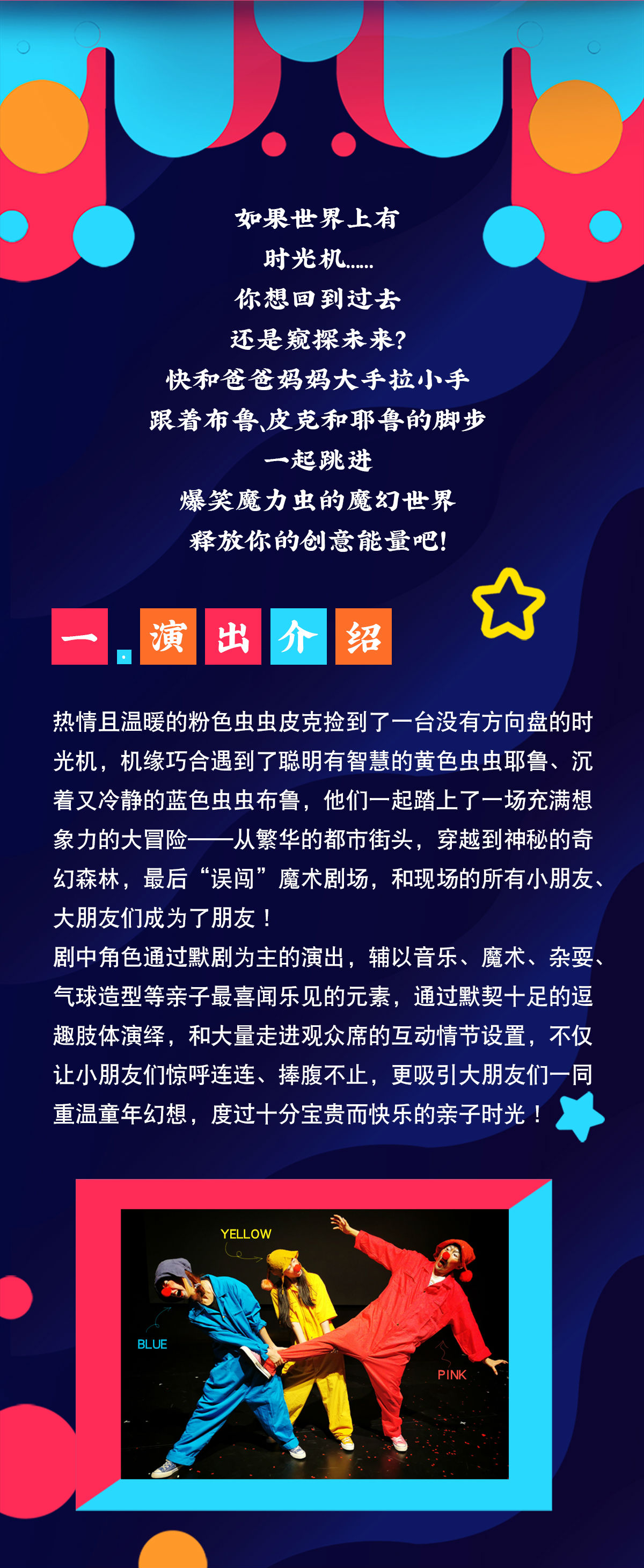 热情且温暖的粉色虫虫皮克捡到了一台没有方向盘的时光机,机缘巧合遇到了聪明有智慧的黄色虫虫耶鲁、沉着又冷静的蓝色虫虫布鲁,他们一起踏上了一场充满想象力的大冒险--从繁华的都市街头,穿越到神秘的奇幻森林,最后"误闯"魔术剧场,和现场的所有小朋友、大朋友们成为了朋友!