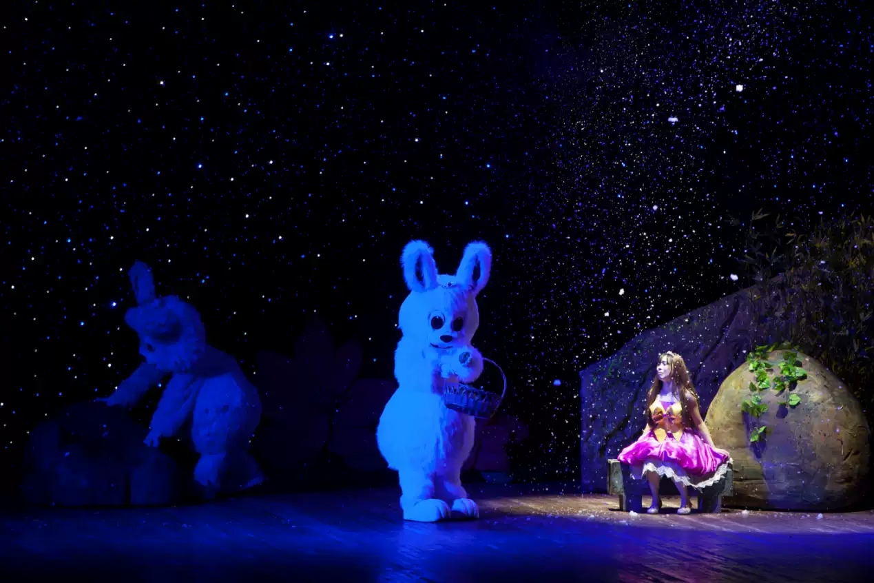 为了最大化的营造剧目各方面的氛围,创作方瑜源文化在舞美方面下了重本。呈现在观众面前的总共有7幕不同的场景。分别有:用灯光营造的意境序幕、金碧辉煌的皇宫、阴森的女巫家、漫天星星的山谷、森林小矮人的树屋、月光下的小树林。剧目创作者们用实实在在的舞美设计塑造出大场面、大气势、大场景的舞台环境,给观众美妙的视听感觉。