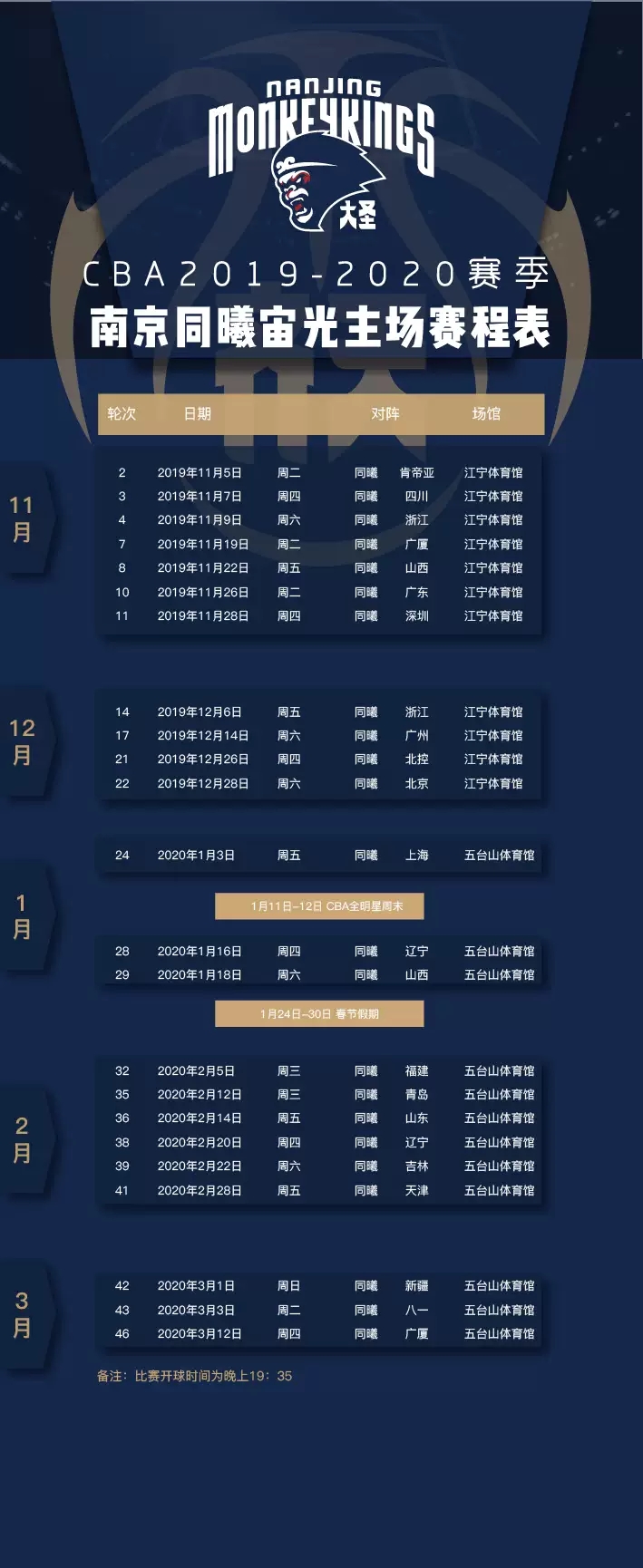 南京同曦男篮首场主场比赛将于11月5日打响,坐阵主场江宁体育馆迎战德比球队苏州肯帝亚队。根据上赛季球队的最终排名,20支参赛球队蛇形排列分为4组,南京同曦与辽宁、广厦、山西、浙江分入一组。赛制则与上赛季保持一致,采用主客场制,同一小组之间四循环、不同组双循环。比赛强度稍有消减,由上赛季一周三赛改为三周八赛。