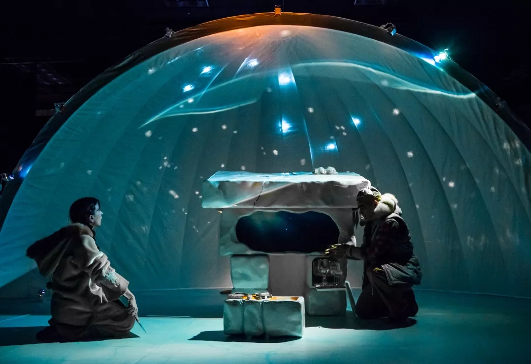她让冰屋撩开神秘面纱化作整个舞台,巨大的穹顶,时而繁星密布,极光涌动,时而映射冰下独角鲸孤独游弋的身影,时而圆月当空,成群麋鹿飞跃地平线……孩子们围坐在冰屋周围,屏息注视着见所未见的异域传奇,冷不丁Elisapee骑着壮实的麝牛,从身边呼啸而过!