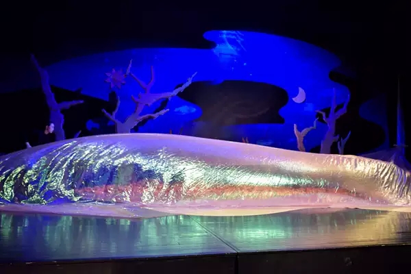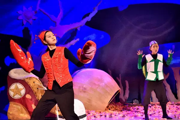 眼睛是孩子认识世界的窗户,在孩子看来,色彩几乎是整个世界。他们利用色彩和世界对话,利用色彩和世界交流——对于事物的认识、辨别、选择多是根据对视觉有强烈感染力的色彩进行的。《小海龟的奇妙历险》带给孩子一个奇幻的海底世界,在观剧的过程中丰富变幻的色彩给孩子不同的心理刺激,启发他们对色彩的感知并激发他们的好奇心。