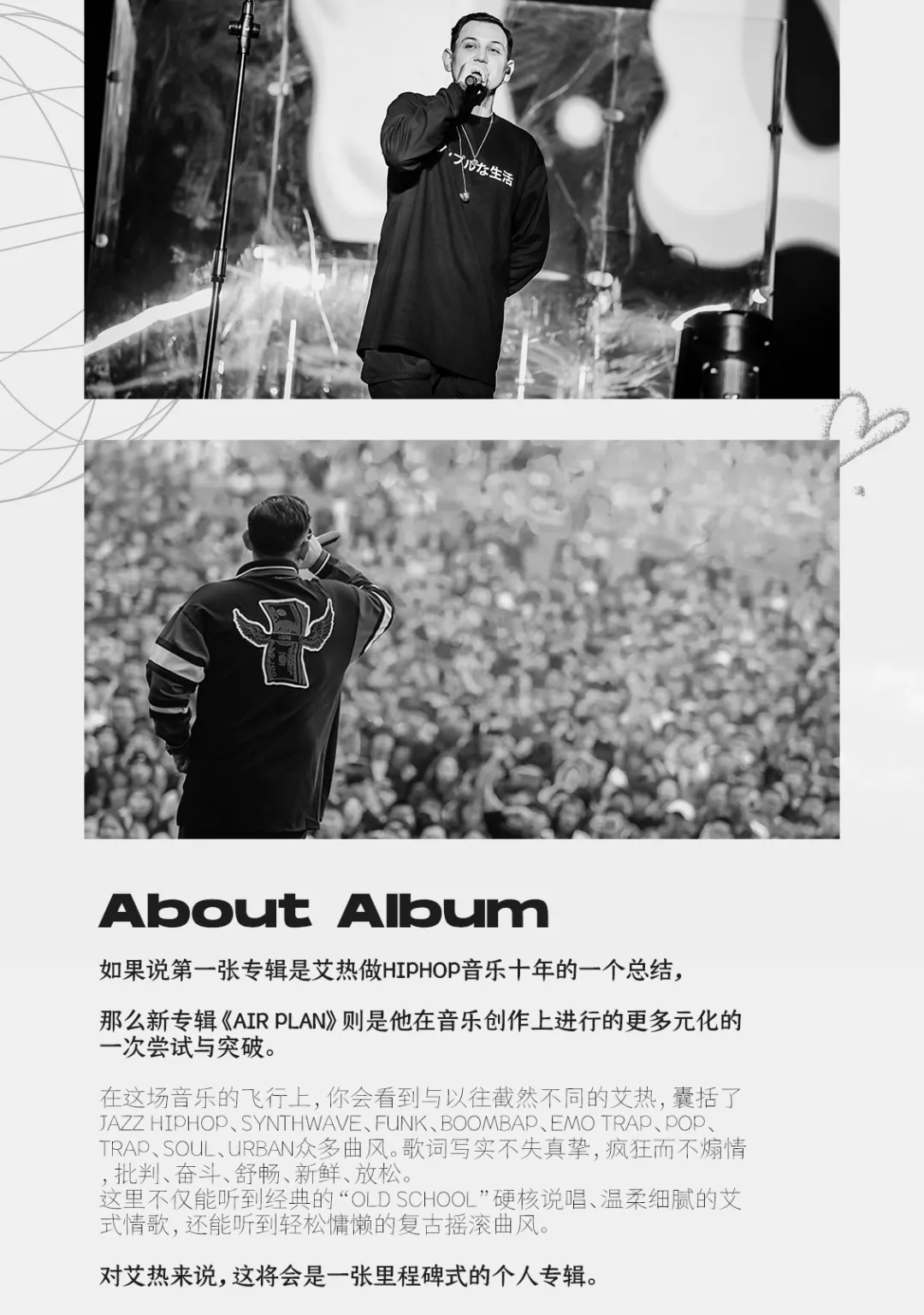 如果说第一张专辑是艾热做Hiphop音乐十年的一个总结,那么新专辑《Air Plan》则是他在音乐创作上进行的更多元化的一次尝试与突破。在这场音乐的飞行上,你会看到与以往截然不同的艾热,囊括了Jazz Hiphop、Synthwave、Funk、Boombap、Emo Trap、Pop、Trap、Soul、Urban众多曲风。歌词写实不失真挚,疯狂而不煽情,批判、奋斗、舒畅、新鲜、放松。这里不仅能听到经典的“Old School”硬核说唱、温柔细腻的艾式情歌,还能听到轻松慵懒的复古摇滚曲风。对艾热来说,这将会是一张里程碑式的个人专辑。