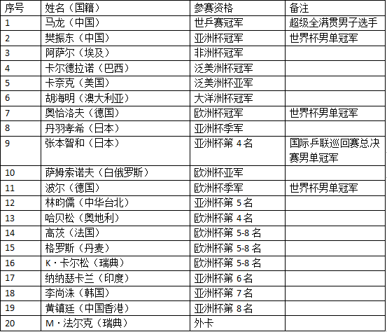 乒乓球作为中国国球,这项运动也成了国民最重视的运动,上至公园里的老人,下至小学校园里的小学生,都能在他们的手中看见乒乓球拍的身影。中国选手在国际赛事上的表现也是十分出色,为中国赢得无数奖牌。下面是参赛人员名单: