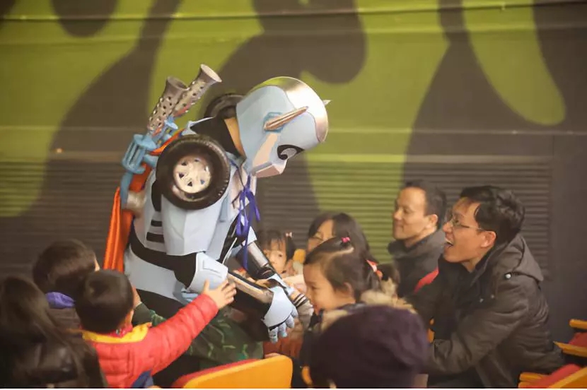 更加让人惊喜的是,一个酷似变形金刚的"汽车人"也出现在演出阵容中,与小观众们互动。