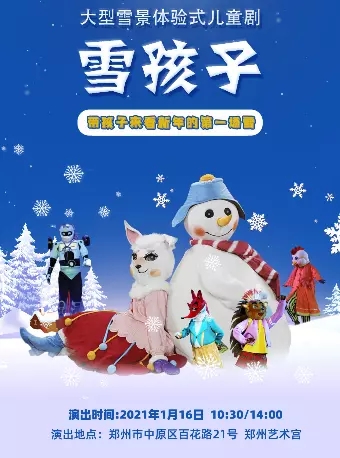儿童剧《雪孩子》郑州站,请准时入场,配合安检人员检票,检票后有序入场,不要窜区、窜位。文明观看演出,遵守现场秩序,请勿翻越隔离设施。观剧过程中,请照顾好您的小朋友,坐在前排的观众请让孩子远离舞台;请保持安静,尽量减少与孩子探讨剧情;让我们用心地感受剧情。感谢您的支持!