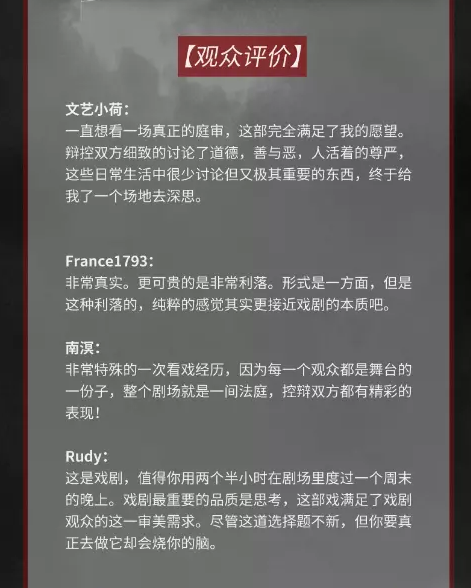 在《裁决》中,探索着到的与原则法律与情感之间的锚段与关系,让观众们从中探讨了“袭击”与“恐怖”的终极议题。在现场,每一位观众都是舞台的一份子,整个剧场都是一间法庭,控辩双方都有非常精彩的表现!
