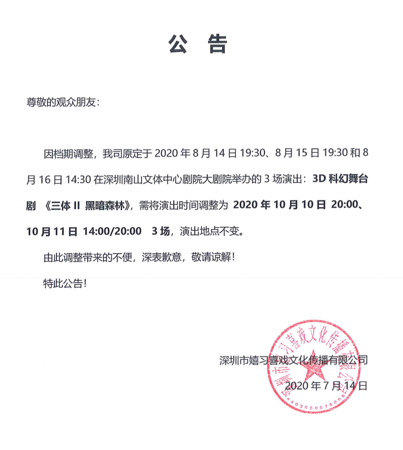 2020舞台剧三体黑暗森林深圳站,请提前入场,配合安检人员检查,不得携带打火机、易燃易爆、毒害性、辐射性、管制刀具等危险物品进场。文明观看演出,遵守现场秩序、请勿翻越隔离设施。演出结束后,请留意自己身边是否遗留垃圾,并协助把垃圾带走。有序退场,谢绝逗留。感谢您的支持!