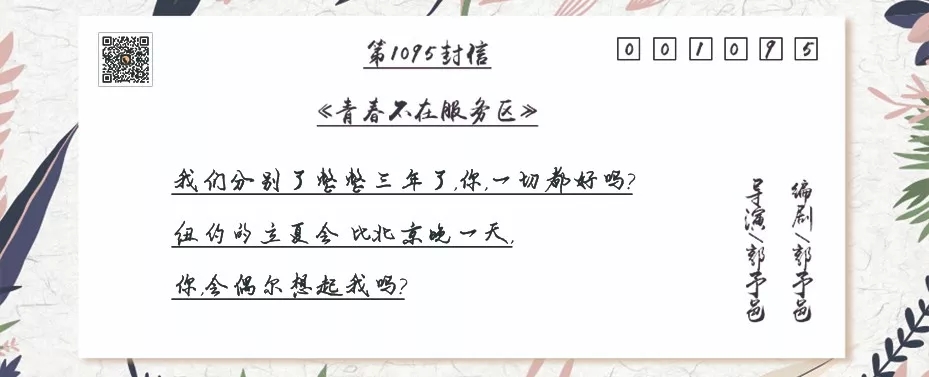 29岁的白兰和众多在北京打拼的年轻人一样,除了面临工作上的压力,还要面对父母的催婚。经过重重相亲,白兰认识了诸葛明,一个相对来说条件不错的男人。但是,却在阴差阳错中,卷进了“被小三”风波。白兰关注的自媒体作家陶小夭从头至尾倾听了这个故事,并记录下来,作为自己的第1095封“未寄出的信”。到底是什么样的感情促使陶小夭在三年内写了1095封未寄出的信呢?青春不在服务区,向您讲述三段即将“青春不在”的爱情故事,以及,“对于青春流逝的心情。”