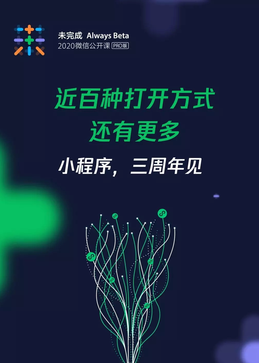 万物繁荣,依旧生长不歇,2020广州微信公开课,第六年,再次与你准时相约。拥抱好奇,每年,我们一起解锁这个生态的疑问。微信公开课PRO将以“未完成Always Beta”为主题,和你继续来聊微信特别的“又一年”。