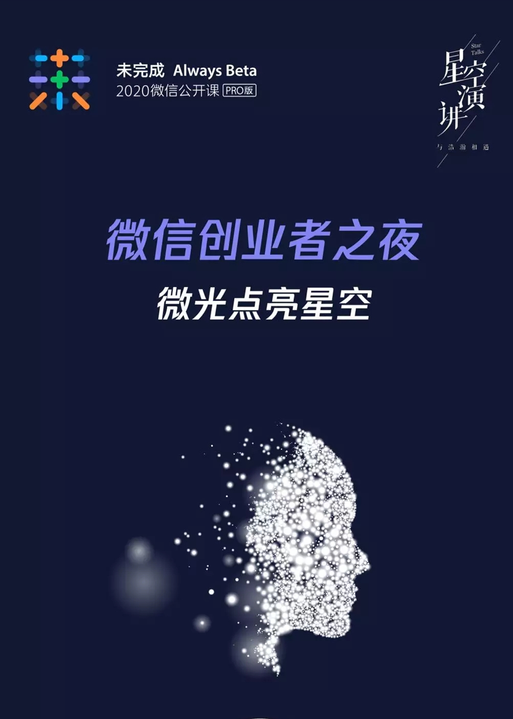 2020微信公开课PRO首次升级特色环节“微信创业者之夜”,将联手星空演讲打造一个专属微信生态创业者的舞台。