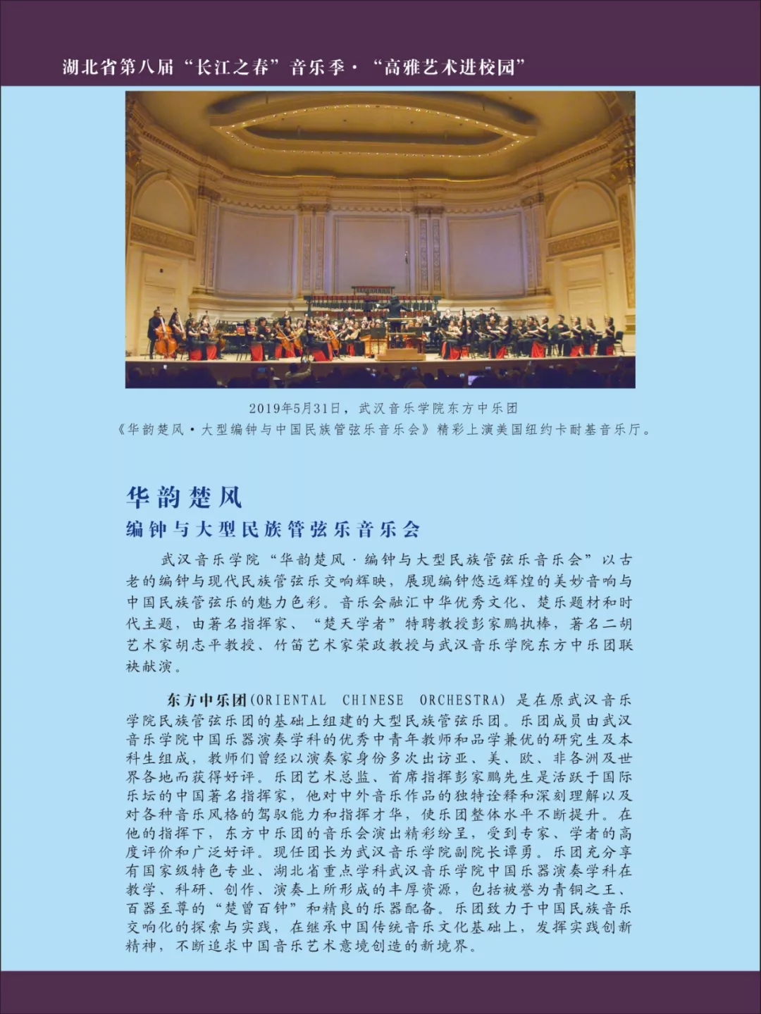 2019华韵楚风武汉新年音乐会,在继承中国传统音乐文化基础上,发挥实践创新精神,不断追求中国音乐艺术意境创造的新境界。