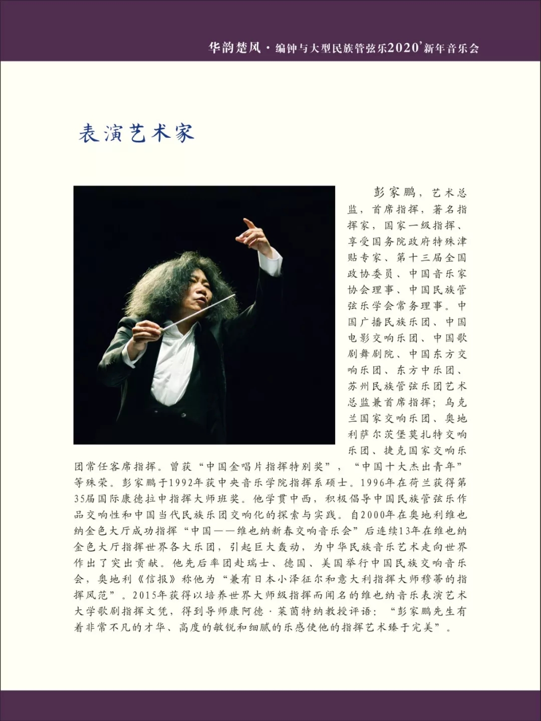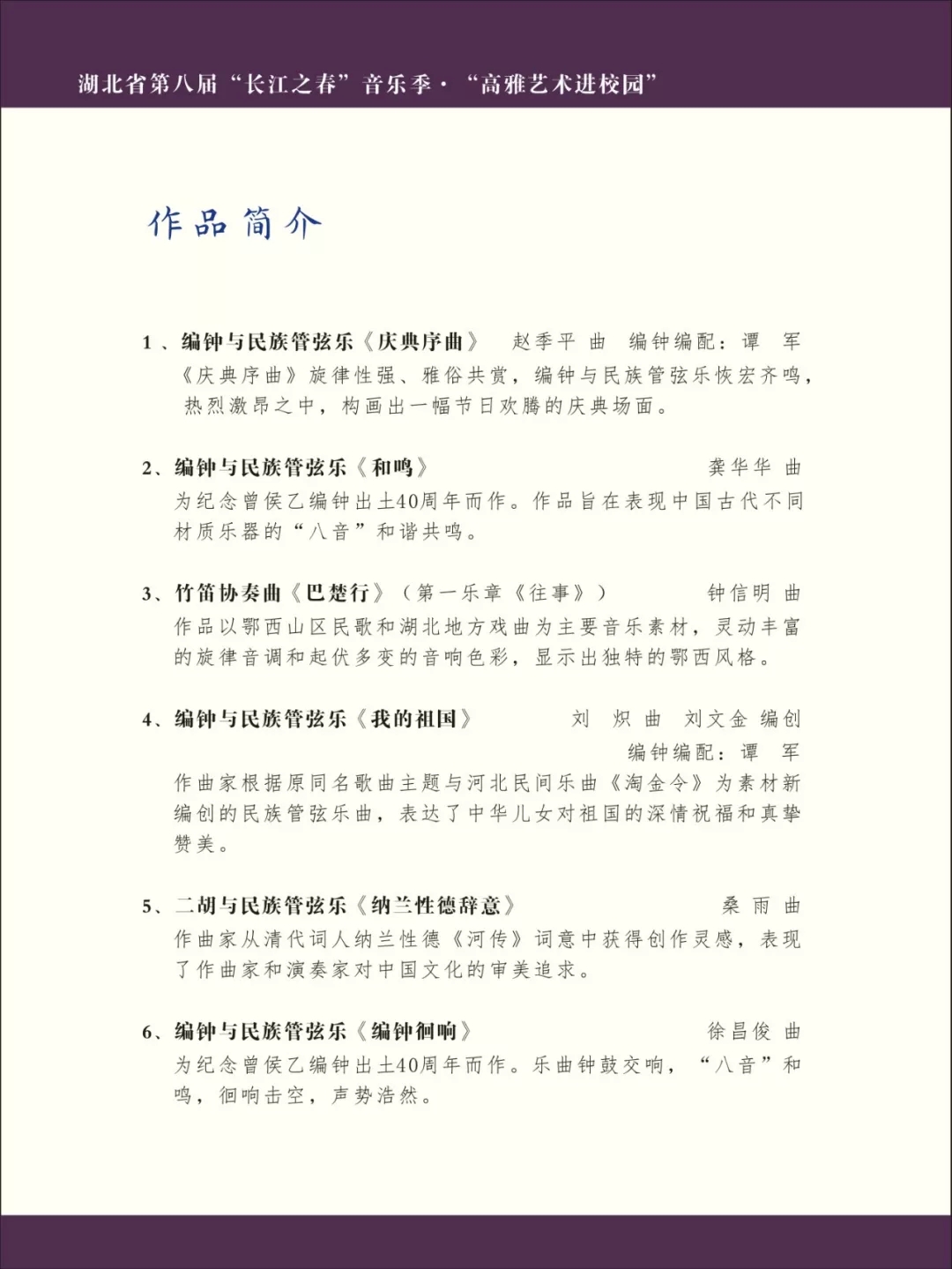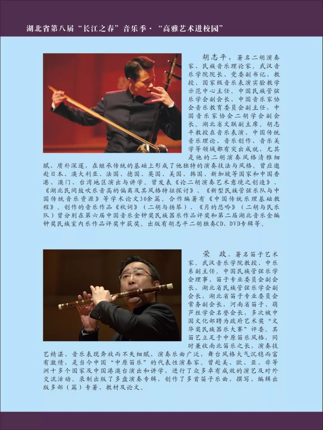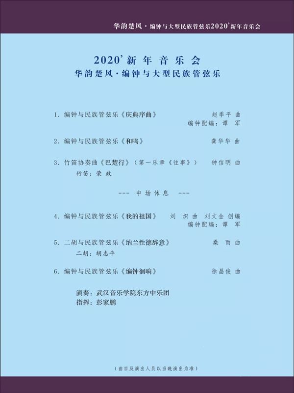 由湖北省教育厅主办,武汉音乐学院、武汉琴台音乐厅承办,武汉音乐学院东方中乐团与著名指挥家、“楚天学者计划”特聘教授彭家鹏,著名二胡艺术家、音乐理论家胡志平,竹笛演奏家荣政联袂演出的2020’新年音乐会——华韵楚风·编钟与大型民族管弦乐音乐会 将在武汉琴台音乐厅上演。