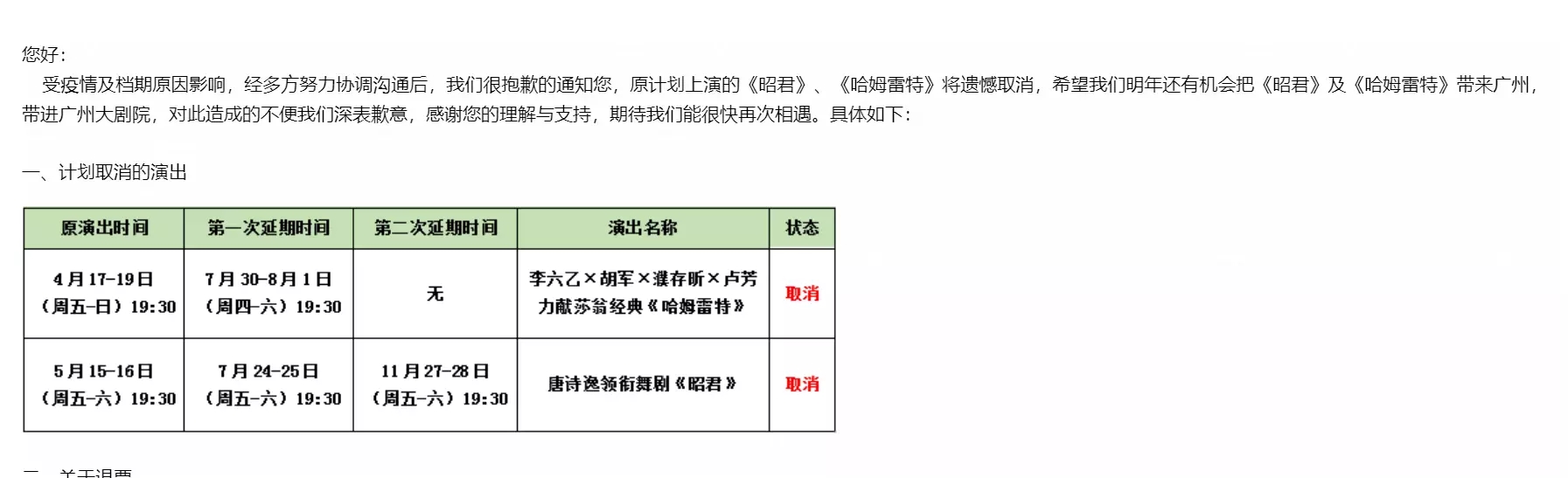 演出状态:演出结束