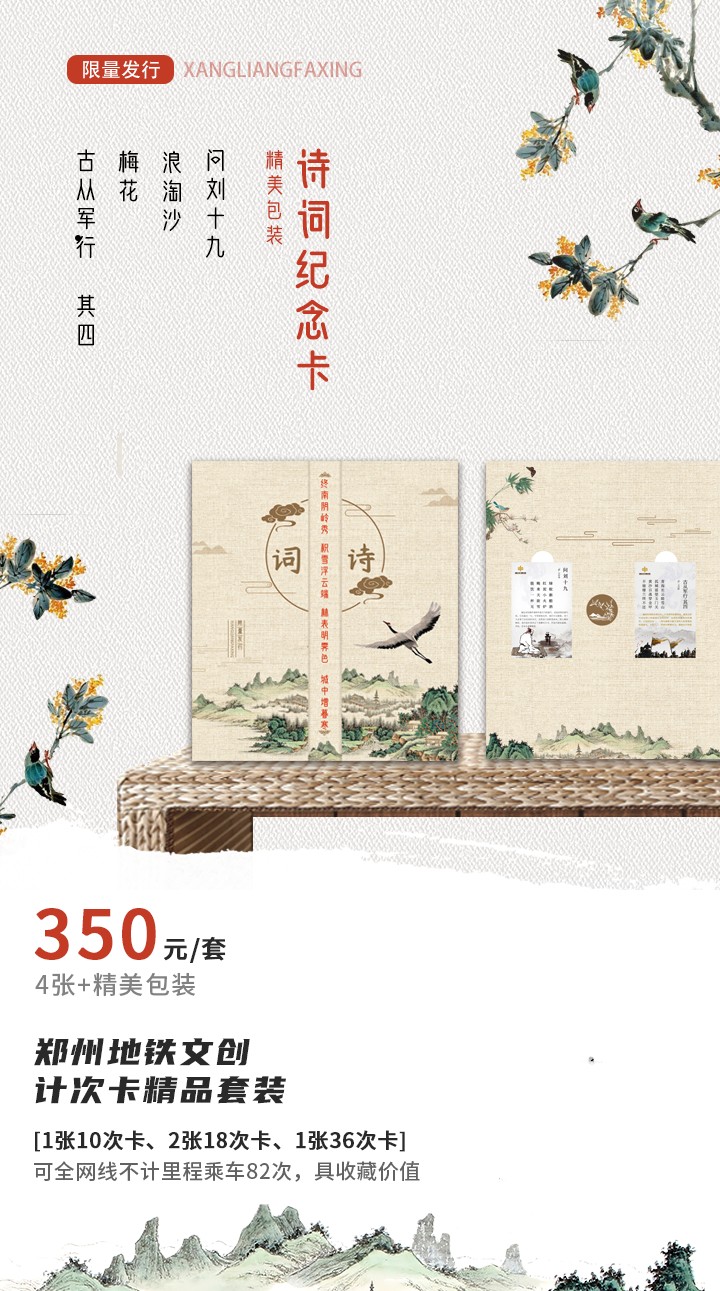 2020郑州地铁文创计次卡,本套诗词文创计次卡以中国古诗词和传统水墨相融合,采用4首著名诗词,设计不同卡面,《浪淘沙》刘禹锡、《问刘十九》白居易、《梅花》王安石《古从军行》王昌龄 ,非常适合收藏纪念!