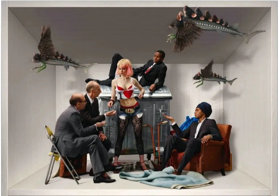 在这个宗教法规被彻底翻转的异想世界中,身穿短礼裙的女人对笼子里和类似宜家家具的装置上的男人进行着挑逗折磨;一个国际董事会被他们穷困潦倒的替身篡夺;穷鬼施舍富人;一个屠夫被一头猪宰杀;像病毒一样的物体萦绕在自拍的人们周围,并在这些毫无察觉的人的身上落脚……
