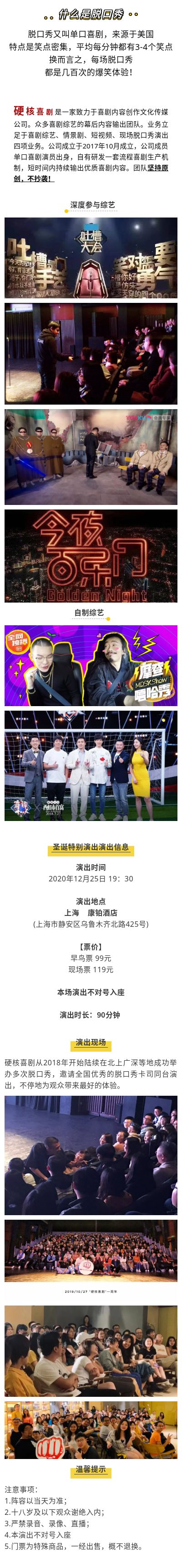 硬核喜剧圣诞特别演出上海站,请您务必在演出开始之前有序入场、对号入座,遵守安检秩序;迟到的观众要听从场务人员安排安静入场或等候幕间入场。请在演出过程中保持安静,务必关闭手机或者将手机设置为静音,请不要说话,需要交流的,请您等到散场后。感谢您的支持。