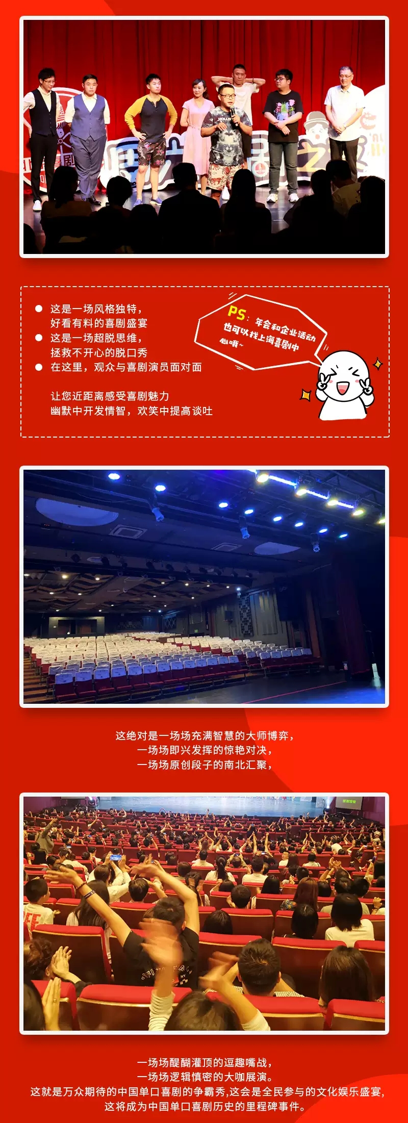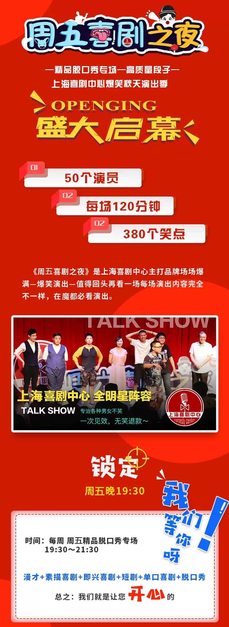 周五夜现场上海喜剧之夜,这是一场打破传统,好看有料的喜剧盛宴,这是一场超脱思维,拯救不开心的爆笑脱口秀,让你近距离感受喜剧魅力,幽默中开发情智,欢笑中提高谈吐。