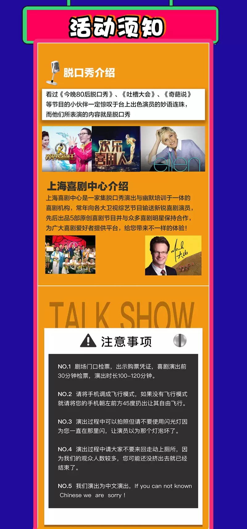 周六狂欢节上海双拼喜剧专场,请勿携带易燃易爆、毒害性、辐射性、管制刀具等危险物品进场。演出开始前请提前30分钟进场,每票一人,对号入座,进门一次有效。迟到观众请幕间在引导员引导下入场,并就近入座。感谢您的支持。