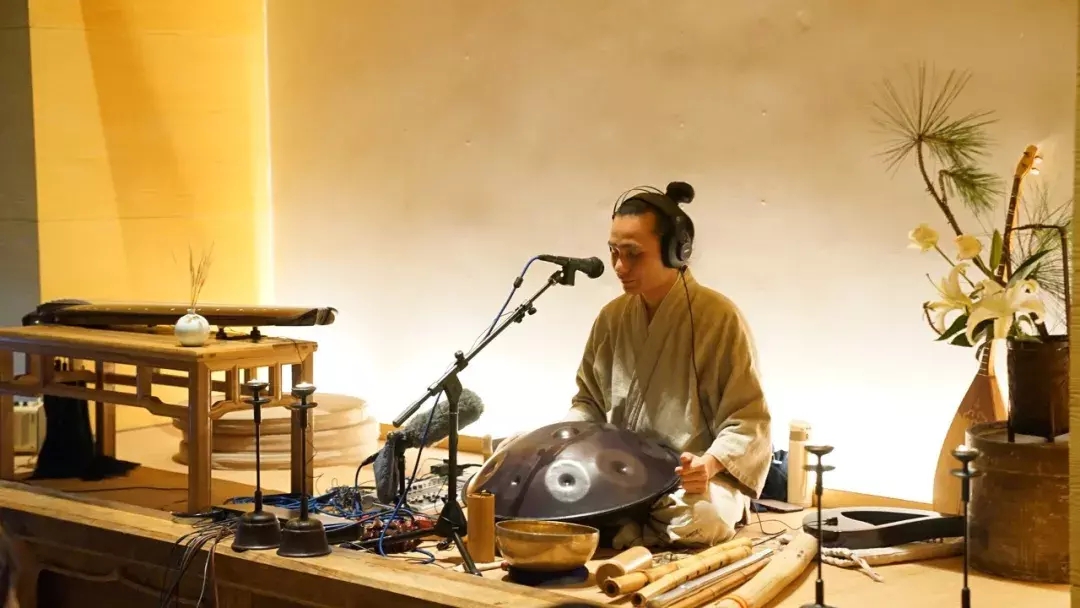 蒲团、木桌、随意摆放着古琴,以及一些叫不上名字的乐器,穿过天窗扑进来的光里,阿坚老师一袭白衣,抚琴而歌,仿佛是画中走出来的人。