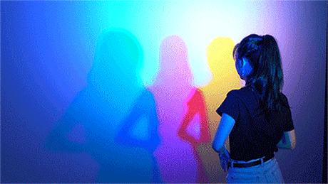 光影艺术装置,原本白色的墙壁,走近后突然产生三种不同颜色的影子,太神奇啦。