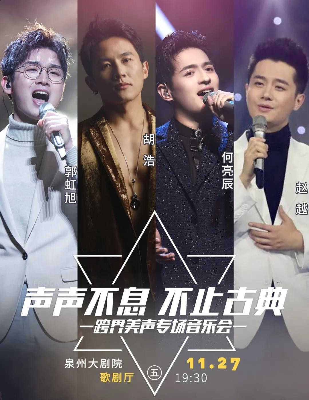 11月27日,赵越、郭虹旭、何亮辰、胡浩四位唱将,将在泉州大剧院为大家带来一场跨界美声专场音乐会!《声声不息·不止古典》泉州演唱会,让我们来享受这场极致的“声入人心”听觉盛宴!