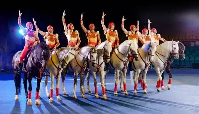 由沙皇御用马术队后裔组成的国际级马队,在飞驰的马背上,他们欢腾跳跃,从马身下纵身上翻,动作干脆利落,带着草原的激情和力量。