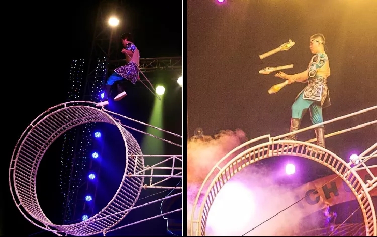 一座“危险的摩天轮”,一阵“呐喊与尖叫”。舞台上两个大轮盘保持微妙的平衡,演员们蒙眼奔跑、跳绳、丢瓶子,轮盘忽上忽下,最高处离地11米,紧张惊险!