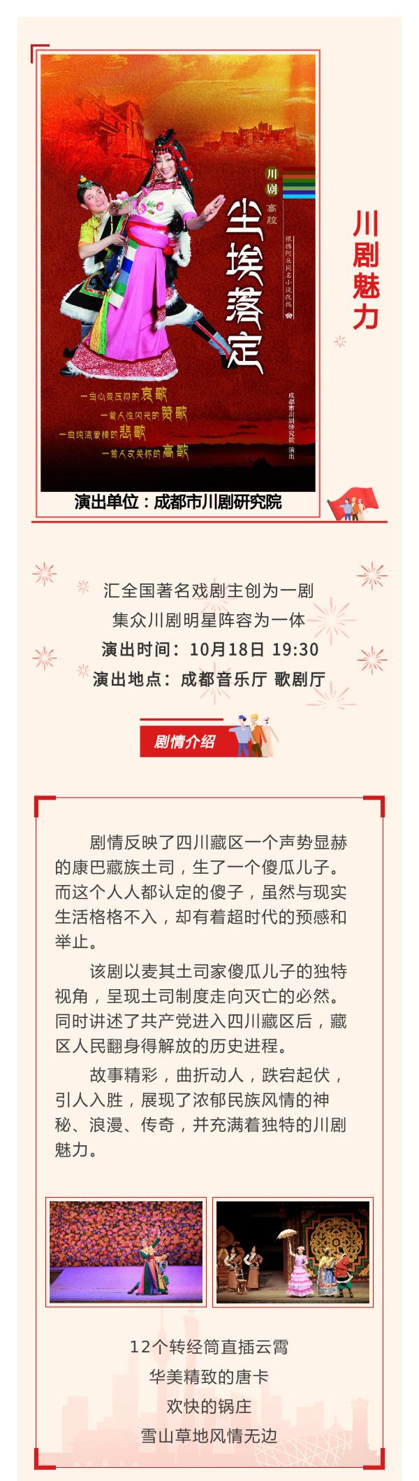 川剧《尘埃落定》成都站,请勿携带易燃易爆、毒害性、辐射性、管制刀具等危险物品进场。演出开始前请提前进场,每票一人,对号入座,迟到的观众要听从场务人员安排安静入场或等候幕间入场。请在演出过程中保持安静,务必关闭手机或者将手机设置为静音,请不要说话,需要交流的,请您等到散场后。感谢您的支持。