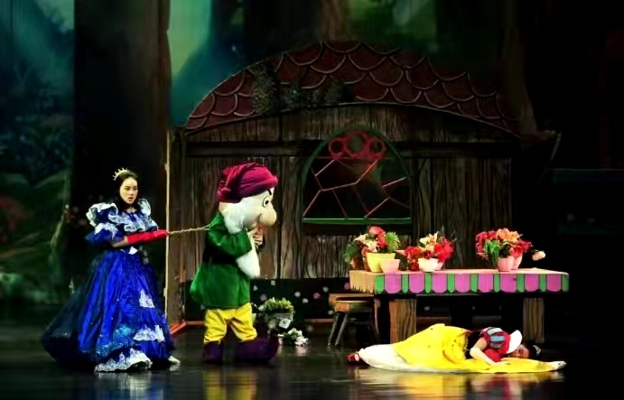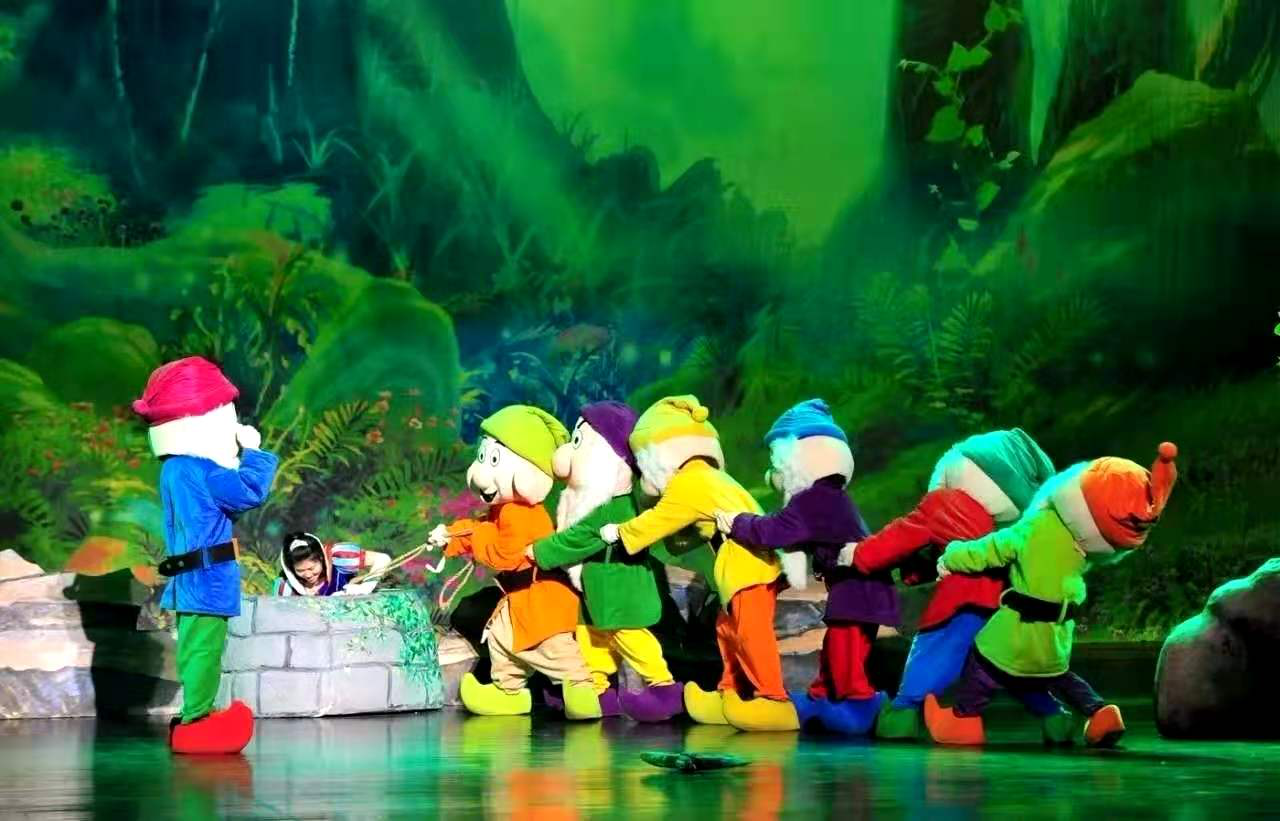 《白雪公主》舞台打造了美轮美奂的童话城堡和森林景象,让孩子走进梦幻的童话王国。为了让“小矮人”更加生动,演员们都要穿上特殊的演出服,透过小矮人的帽子来获得视野,让小矮人瞬间“变矮”,从而与白雪公主形成“身高差”。