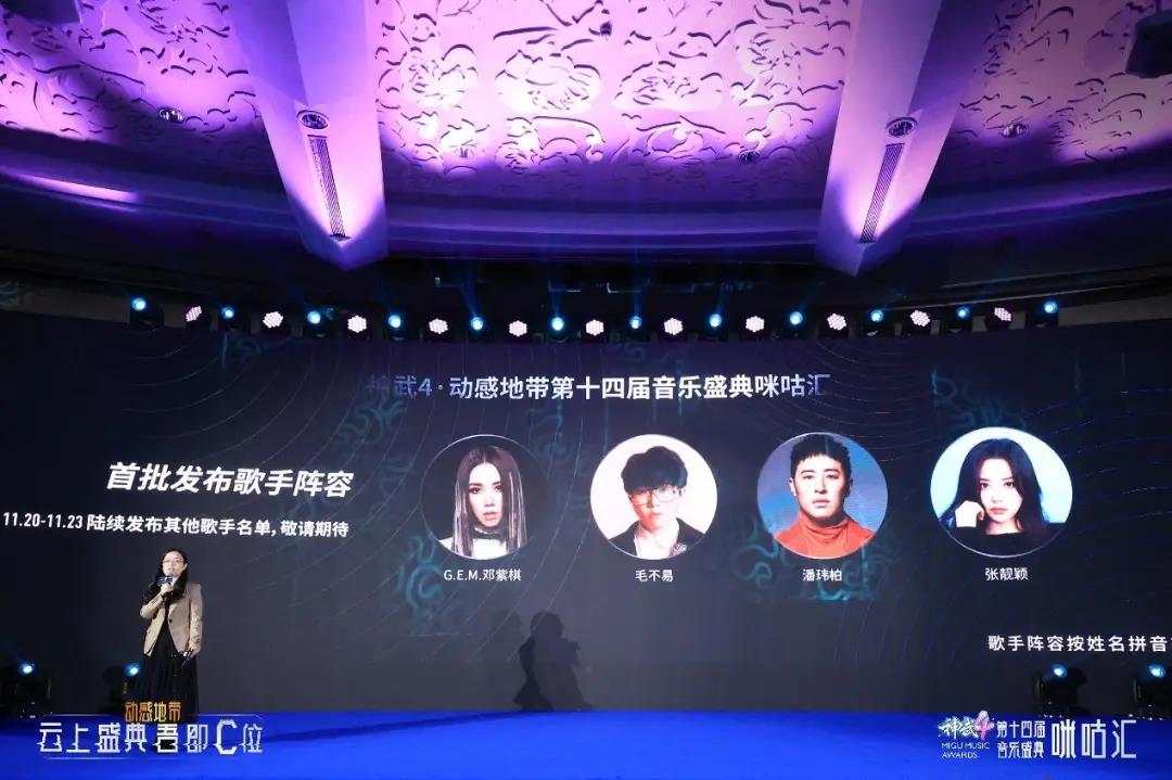 启动仪式上,第十四届咪咕汇首批嘉宾阵容曝光,G.E.M.邓紫棋、毛不易、潘玮柏、张靓颖四位乐坛实力大咖集结助阵,更多星光阵容也将陆续揭晓。本届咪咕汇出席艺人:陈立农、重塑雕像的权利、蔡徐坤、G.E.M.邓紫棋、毛不易、孟美岐、潘玮柏、吴奇、硬糖少女303、TIA袁娅维、ZJ沙楠杰、张靓颖(按首字母排序)。