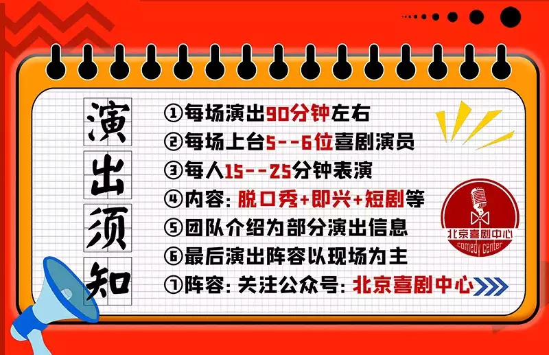 周末喜剧之夜北京脱口秀,请勿携带易燃易爆、毒害性、辐射性、管制刀具等危险物品进场。请您务必在演出开始之前有序入场、对号入座,遵守安检秩序;迟到的观众要听从场务人员安排安静入场或等候幕间入场。演出期间请将手机等响闹装置置于静音状态,勿随意走动,勿妨碍他人观看演出,勿在通道内滞留,勿在场内大声喧哗。感谢您的支持。