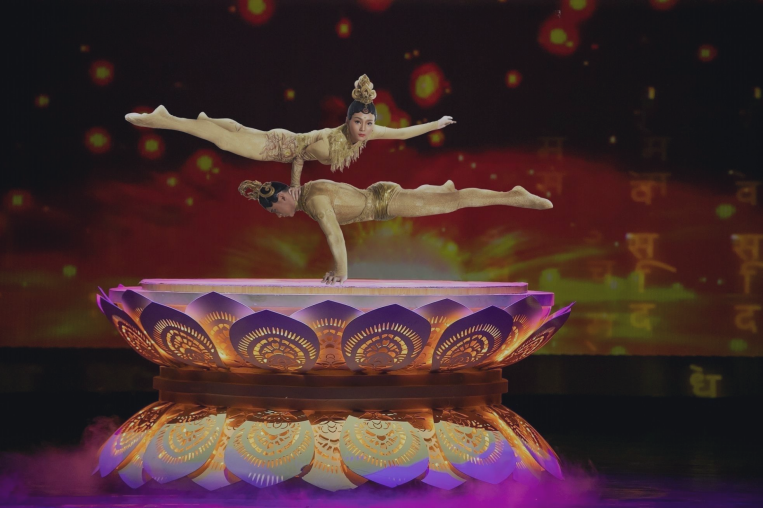 西演战士战旗杂技团的演员们,将人类的极限提升,这一次,他们让穿着芭蕾舞鞋的天鹅站立在王子的肩膀上!