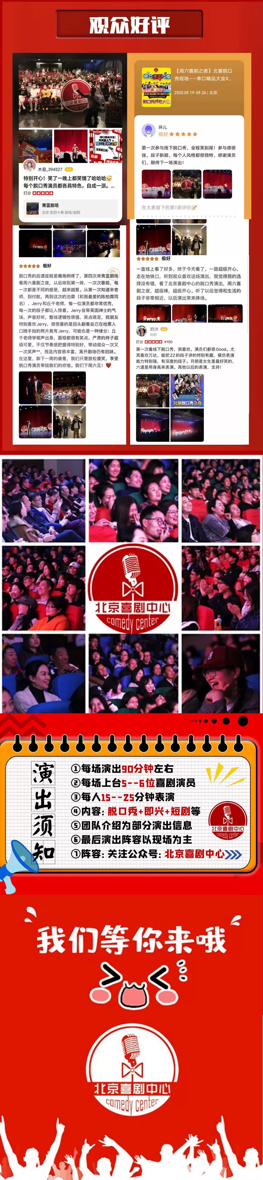 北京喜剧中心圣诞狂欢深夜秀北京站,请勿携带易燃易爆、毒害性、辐射性、管制刀具等危险物品进场。演出开始前请提前进场,每票一人,对号入座,迟到的观众要听从场务人员安排安静入场或等候幕间入场。请在演出过程中保持安静,务必关闭手机或者将手机设置为静音,请不要说话,需要交流的,请您等到散场后。感谢您的支持。